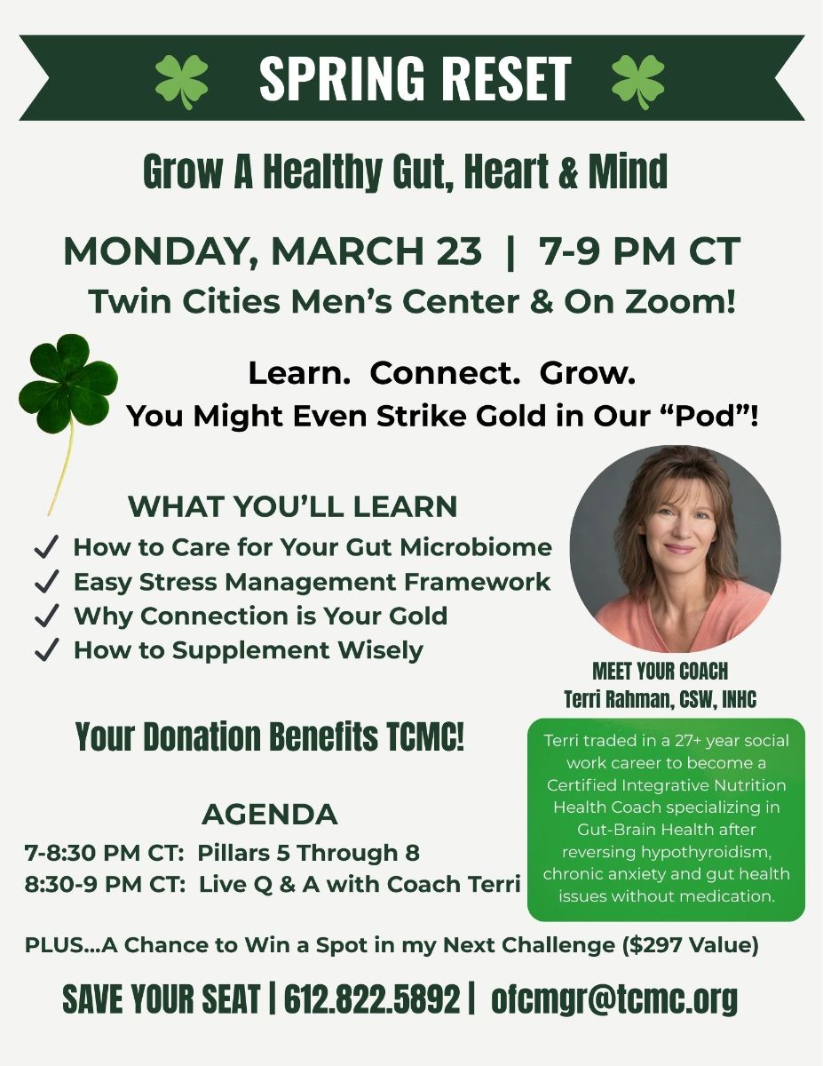 Terri Rahman is returning to the Twin Cities Men's Center, (via Zoom), to help you RESET YOUR GUT for this spring!!! What better way to kick off spring and head into a fantastic summer than to make sure that your gut and your gut's microbiome are both happy and healthy!! And Terri is going to help you do that!!